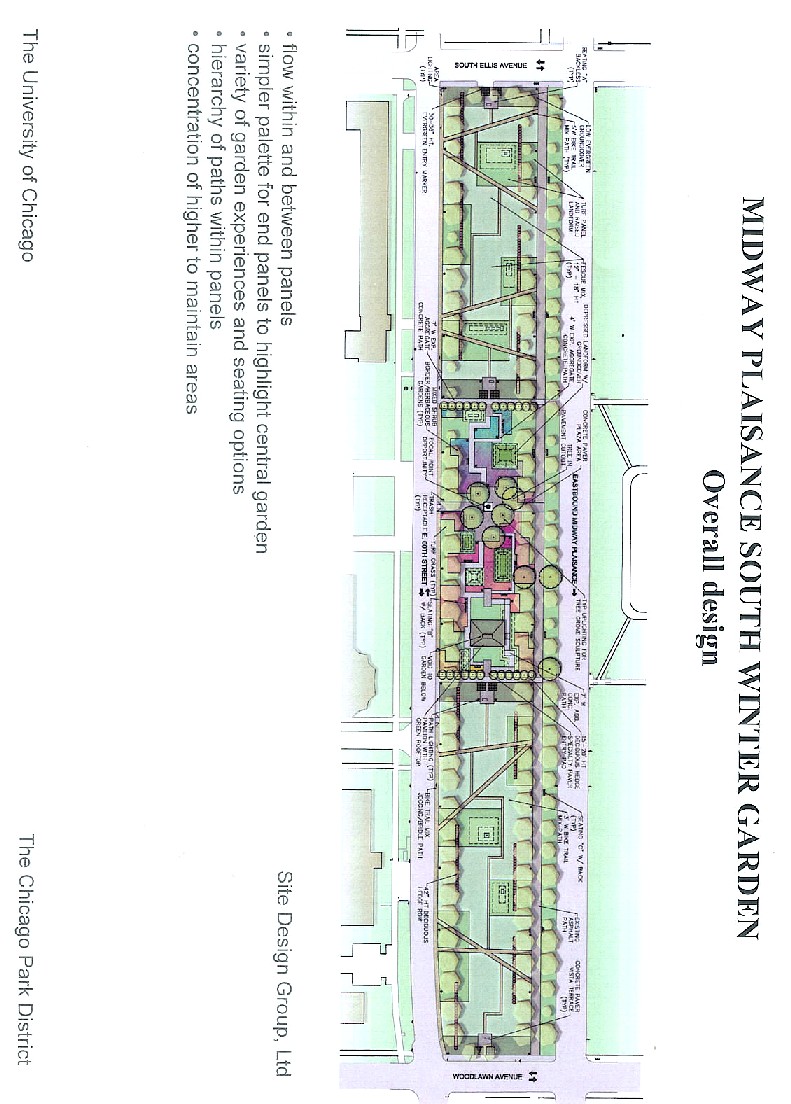 In contrast to the curvilinear, almost Jensenian but still English, plan of the North Winter Garden (which plays off the U of C Gray City while never forgetting it lives within Olmsted's stately line of trees and "canal," the South Garden will be very strictly geometric, playing off Saarinen's Law School and Mies' School of Social Service Administration and even resembling one of Wright's windows (Midway Gardens) or a Mondrian painting. It's unmistakably of the 20th century. It will also have more topographical relief than the North does, including square mounds that are virtual pyramids, plazas, and sweeps of 3-D fescue grasses as well as a garden of both annuals and perennials, and a goodly amount (but less?) of the evergreens that distinguish it as a "winter" garden, of visual interest the year around. There will be a significant rectangular open gazebo that will scream modernist architecture and serve fro gatherings and maybe performances and rituals, have a green roof and a hole in the roof and floor with planted bamboo. Separately there will be a center plaza with a "feature" opportunity--sculpture is being assessed. There will also be both paved desire paths through the panels and a semi maze of straight-line 90- degree angle paths or walls or lines of burning bush low hedges. These will echo both modern design and french formal garden traditions (cf Grant Park). The center third will be abut twice as densely developed as the outer wings. Both garden bed and lawn areas will be sprinkled. A very few existing trees will be removed. The historic bridle and running path (crushed gravel) will be relocated to the outside of the south line of historic trees, along the 60th St. curb. Major crossing paths between main and south campus will be straightened while creating new desire paths. Problems encountered with the North Garden are being avoided.