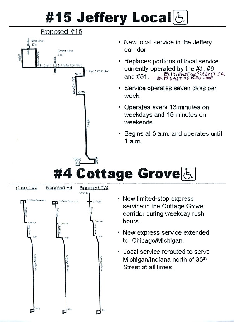 Another serious problems include the #4 Cottage Grove. For Hyde Parkers needing to go to Michael Reese/Advocate (partly because the Hyde Park Advocate Office is closing), this bus no longer goes where you need to go- a double transfer will be needed unless you hoof it to Cottage where you still need one transfer unless you take X4 (available rush hour only. You can take the #1 rush hour only from Drexel/51st.). People near Reese, Prairie Shores, Lake Meadows, and Dunbar are also very upset about this route change.