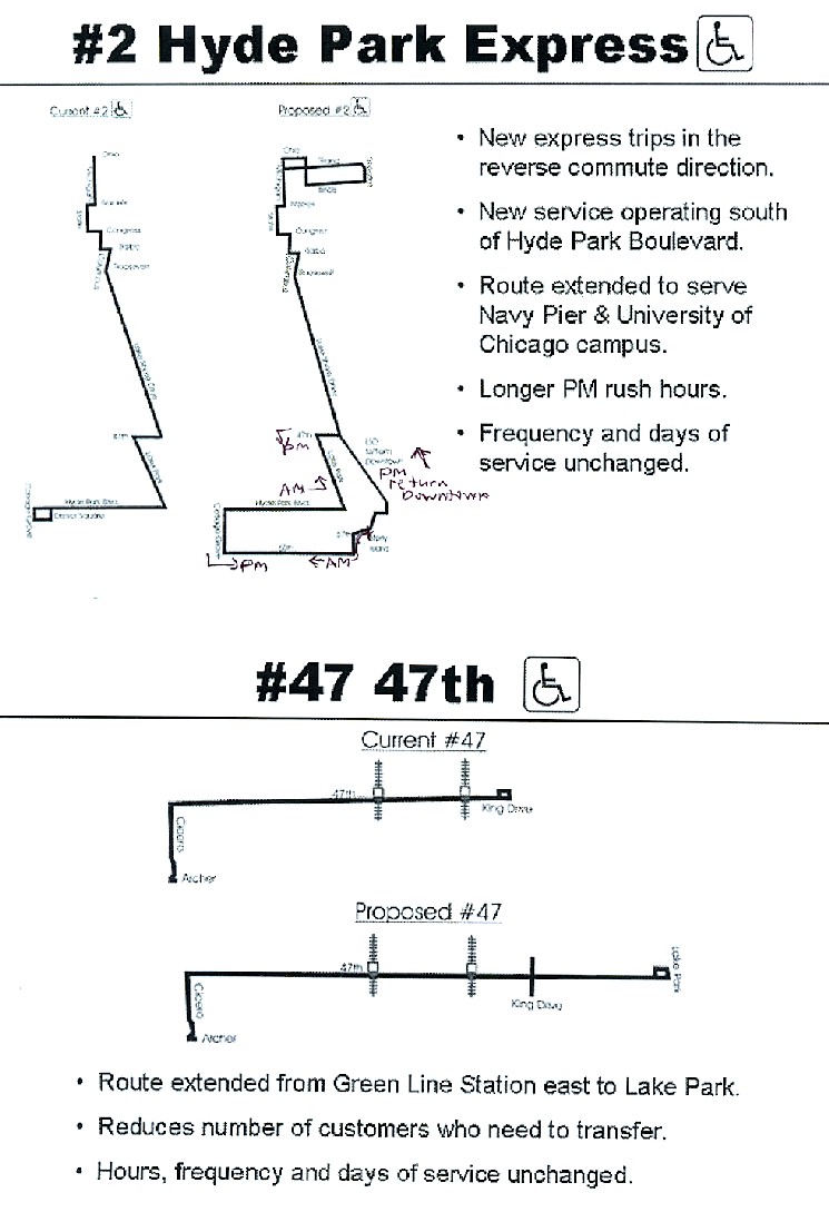 | #2 Hyde Park Express. Buses will substitute State and Balbo for the Michigan and Congress legs between State-Congress and Michigan-Balbo. Reason: reduce turns and traffic delays. |