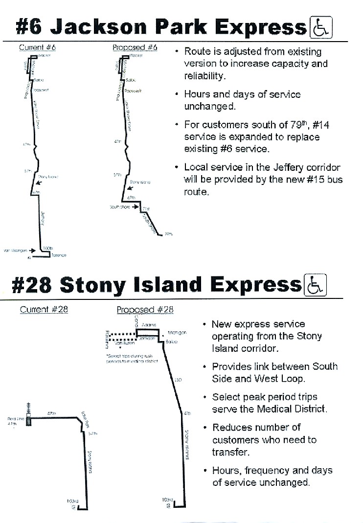 #28 Stony Island Express. Divert to Hyde Park Blvd. rather than use Lake Park between 56th and 51st. Reason: improve (translation restore) downtown travel options for customers and reduce (tr. route-change induced) overcrowding on #6. Eliminate the rush hour leg to the West Side Medical Center. Reason: underutilization, reliability problems from the Loop. Last two northbound night trips to terminate at 47th (affecting post-midnight service). |