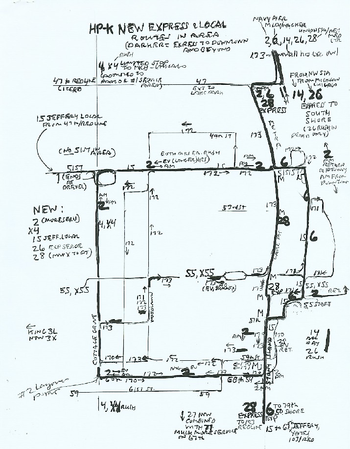 | #15 Jeffery Local. Use Lake Park rather than Hyde Park Blvd. between 51st and 56th. Reason: speedy, efficient, more direct service. |