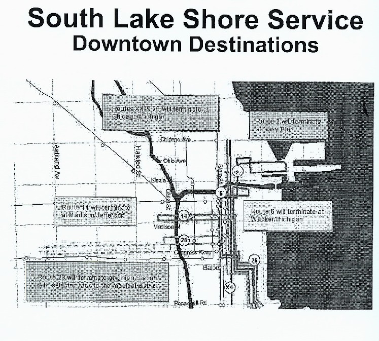 | #6 Jackson Park Express. Southbound will continue south on State to Balbo thence east rather than turning east on Congress then south on Michigan to Balbo. Reason: reduce turns and traffic delays. |